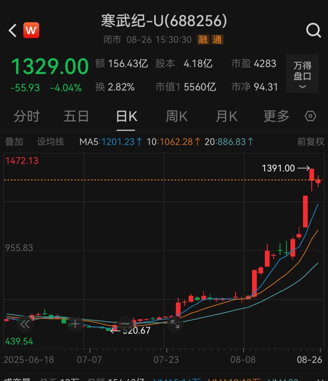 截至8月26日收盘,寒武纪总市值达5560亿元,根据十大流通股东信息显示,陈天石直接持有寒武纪28.57%股份,对应市值约1588.56亿元。